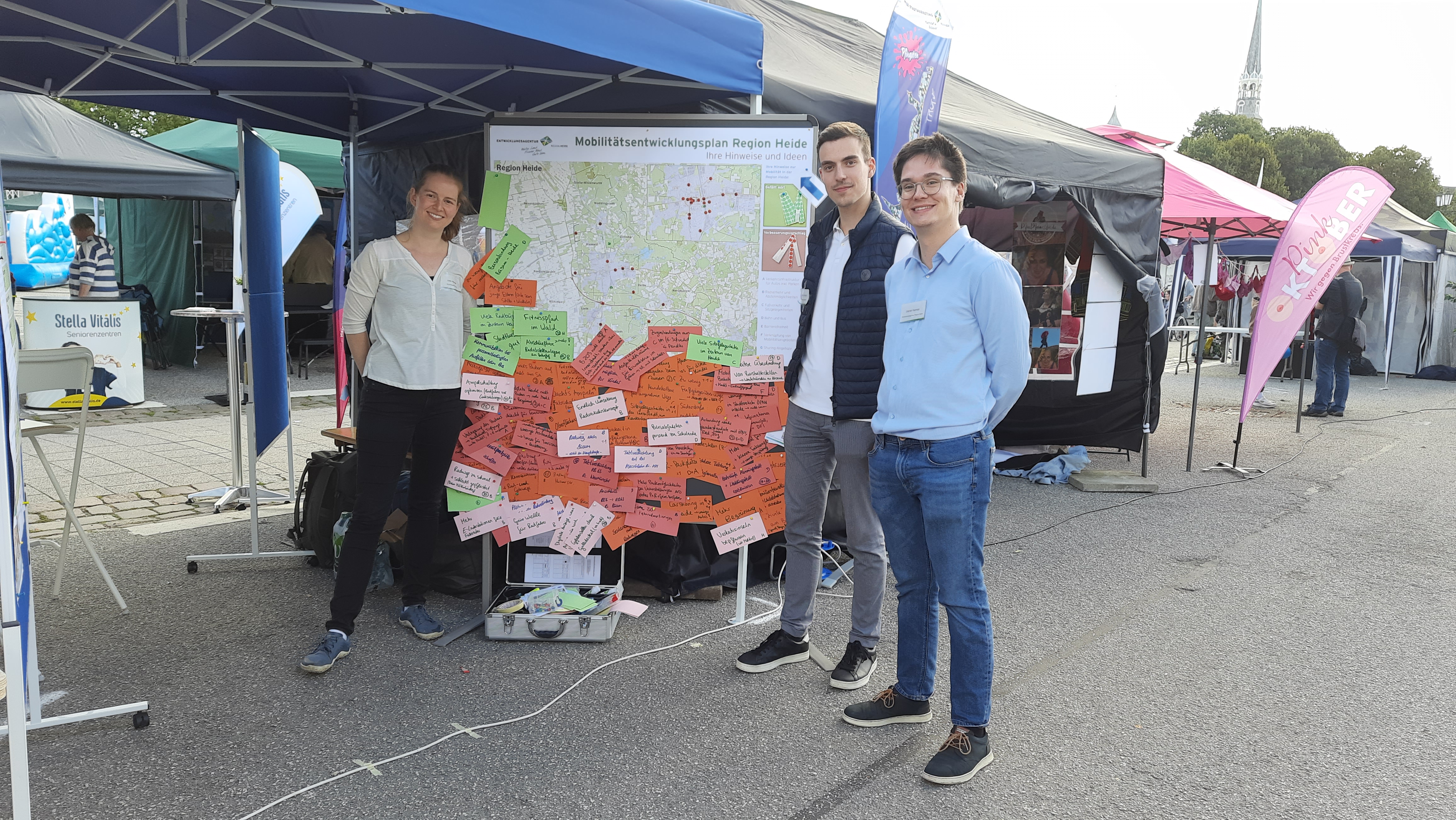 Parallel zur laufenden Online-Beteiligung war der Mobilitätsentwicklungsplan am 06.09.2025 auf dem Dithmarschen-Tag in Heide zu Gast. Bürgerinnen und Bürger konnten sich dort über Inhalte und Ablauf des Planes informieren. Zusätzlich bestand die Möglichkeit, konkrete Lobe und Verbesserungsvorschläge auf einer Karte einzutragen. Zudem ließen sich die Kategorien hervorheben, in denen die Bürgerinnen und Bürger den größten Handlungsbedarf für den Mobilitätsentwicklungsplan sehen. Zuletzt war es möglich, eigene Impulse in Bezug auf die Mobilität in der Region Heide mitzuteilen.